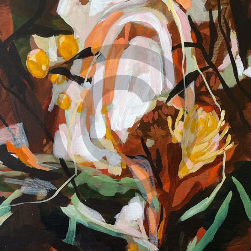 Die Motive und Kompositionen der Acryl- und Ölbilder haben sich durch jahrelange Malerei botanischer Gärten und Gewächshäuser entwickelt. Reflektierendes Wasser und Treppen wirken wie Hindernisse auf der Reise durch den Garten und lassen es dem Betrachter offen, ob das Paradies ein Ort ist, den es zu erreichen gilt oder der sich auf der Reise selbst befindet. Auch gezeigt werden Werke auf Papier, in denen Rorschachtests die Symmetrie und Reflexion einer Wasseroberfläche erzeugen.